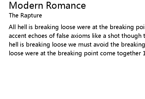 | All hell is breaking loose were at the breaking point accentuated by false accent echoes of false axioms like a shot though the heart come together 3x all hell is breaking loose we must avoid the breaking point all hell is breaking loose were at the breaking point come together 16x |
