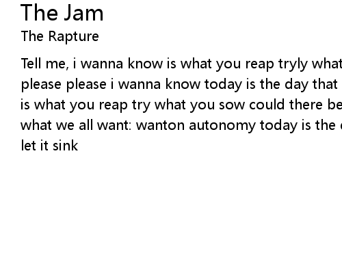 | Tell me, i wanna know is what you reap tryly what you sow i wanna know please please please i wanna know today is the day that i tell you tell me i wanna know is what you reap try what you sow could there be infamy in all this ecstasy? what we all want: wanton autonomy today is the day that i tell you (let it sink) let it sink |