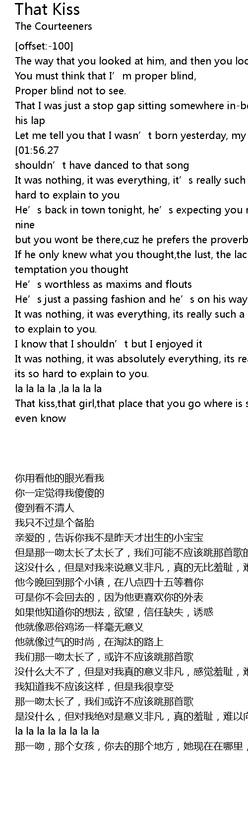 | [00:48.82][01:56.27][03:02.76] | That kiss that lasted too long, we probably shouldn' t have danced to that song |