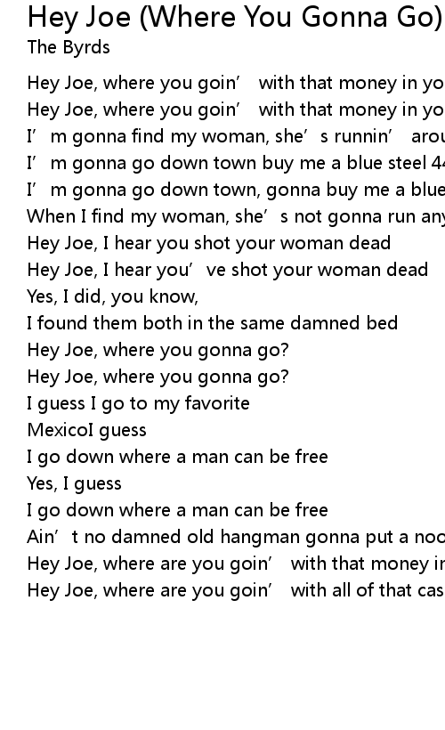 | Hey Joe, I hear you' ve shot your woman dead | |