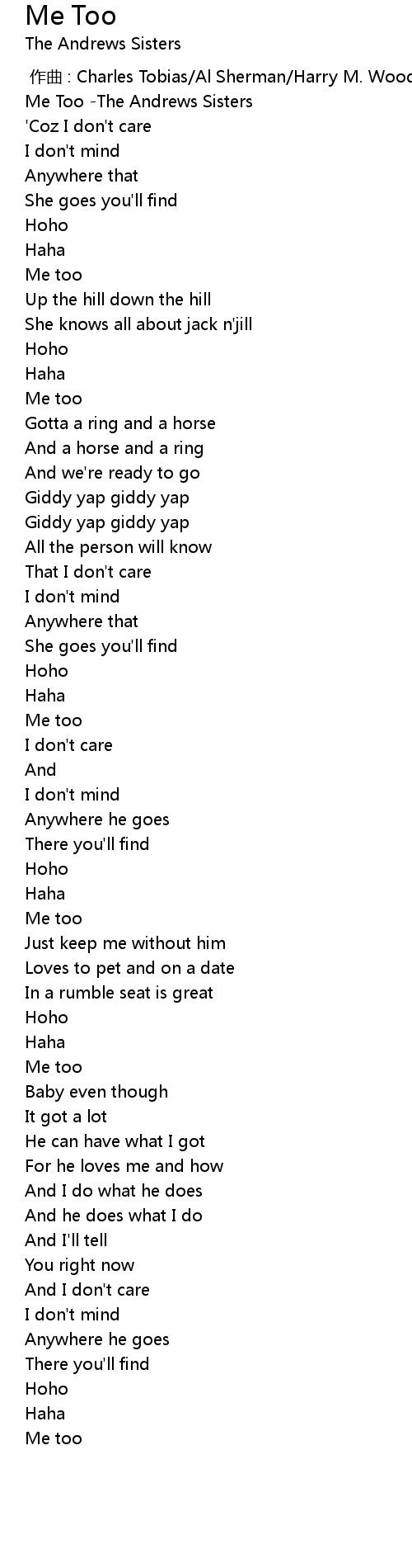 | [00:00.409] | Me Too -The Andrews Sisters |