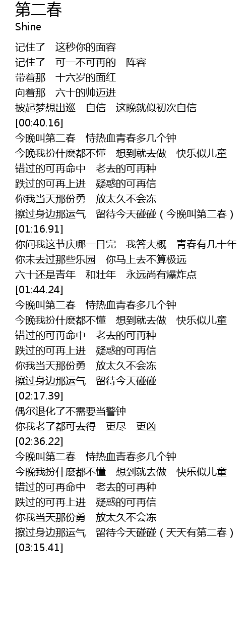 | [02:38.23] | 今晚叫第二春 恃热血青春多几个钟 |