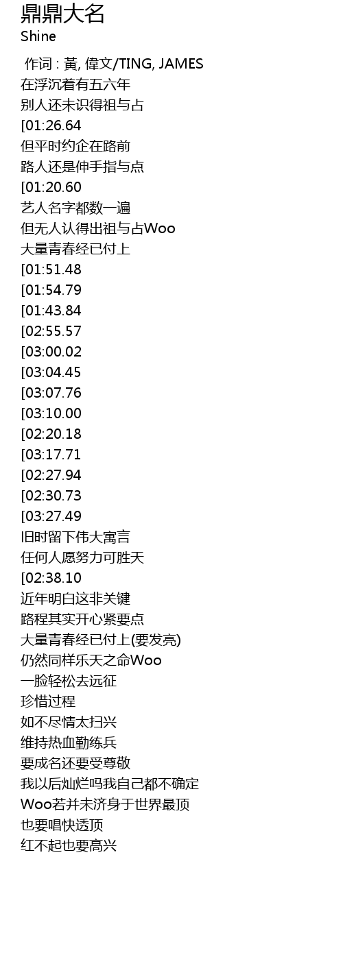 | [00:15.33][01:20.60][03:41.69] | Shine-鼎鼎大名(粤) |