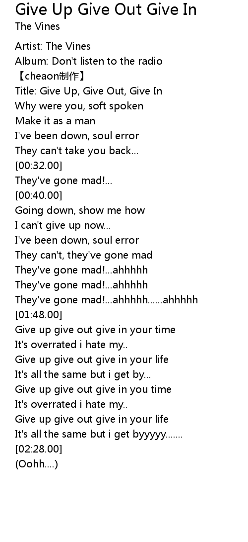| [00:01.11] | Title: Give Up, Give Out, Give In |