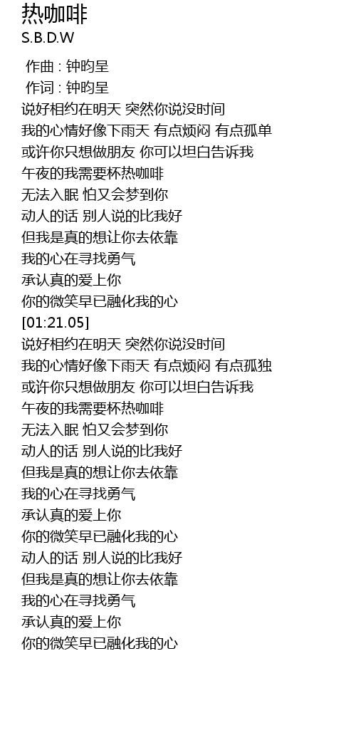 | [01:55.08] | 午夜的我需要杯热咖啡 |