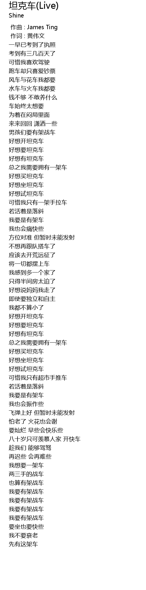 | [01:00.77] | hǎo xiǎng yǒu tǎn kè chē |