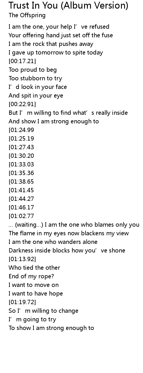 | [02:34.27][01:27.43][00:30.61] | Trust in you. |