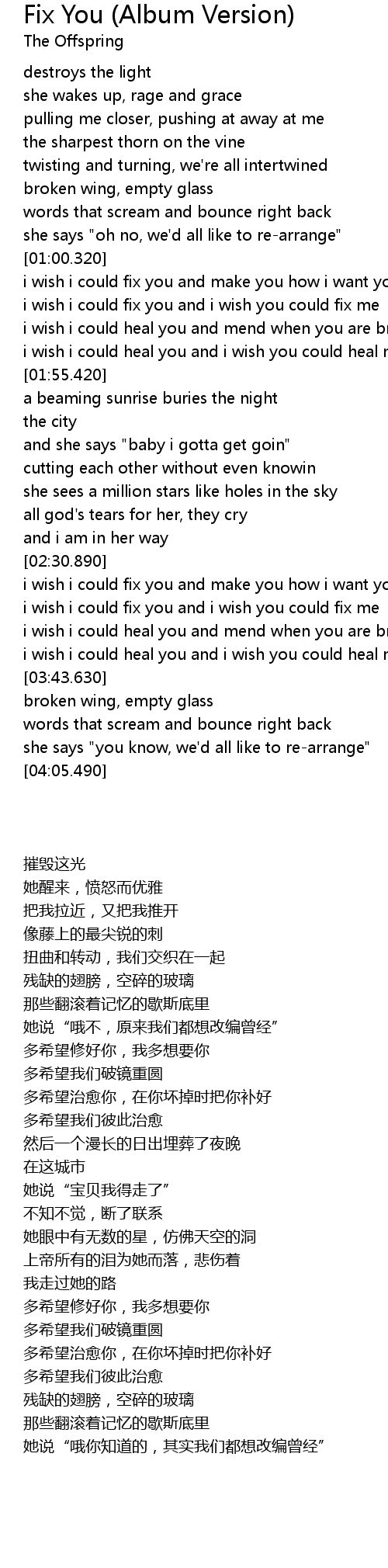 | [01:10.550] | i wish i could fix you and i wish you could fix me |
