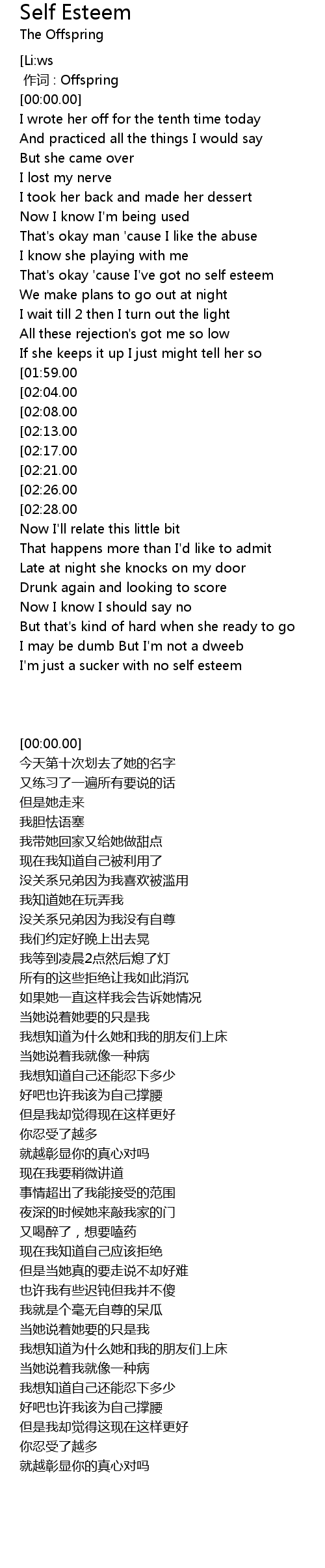 | [01:00.00] | That' s okay ' cause I' ve got no self esteem |