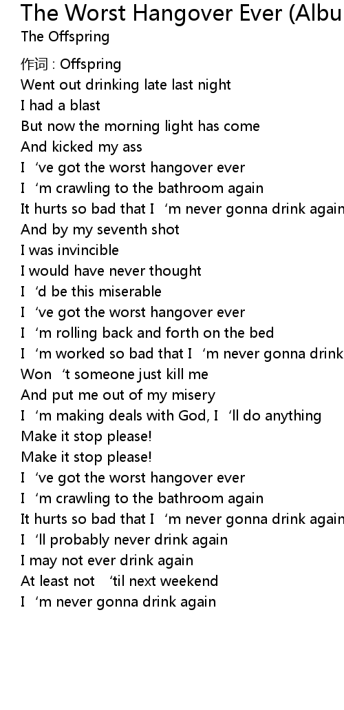 | I‘m worked so bad that I‘m never gonna drink again | |
