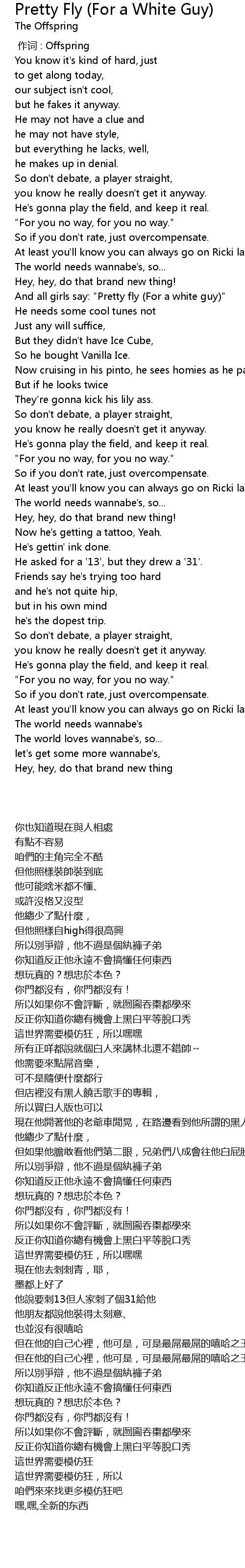 | [01:20.500] | And all girls say: "Pretty fly (For a white guy)" |