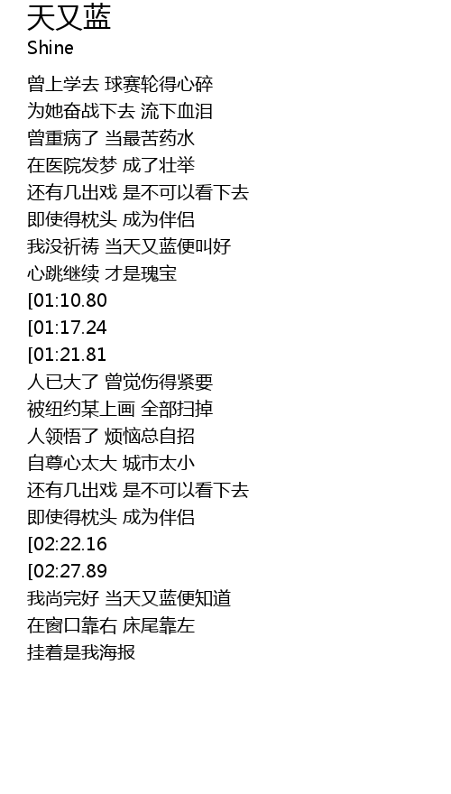 | [03:10.20][02:22.16] | 我没祈祷 当天又蓝便叫好 |