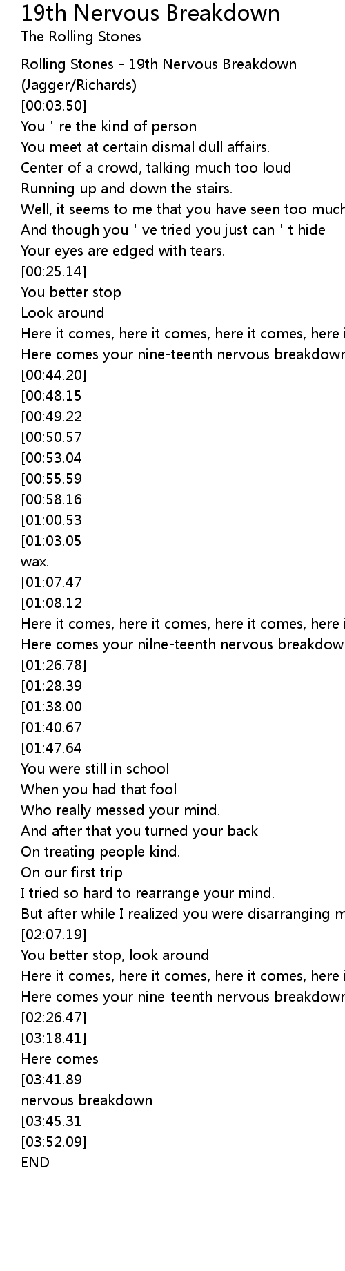 | [03:47.11][03:41.89][03:36.95][03:32.16][03:24.70] | Here comes your nineteenth nervous breakdown |