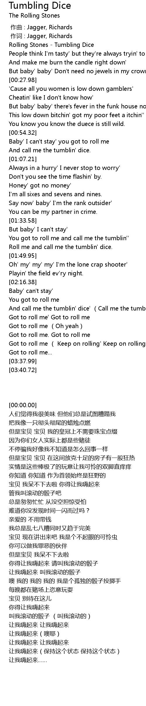 | [02:23.64] | And call me the tumblin' dice' Call me the tumblin' |