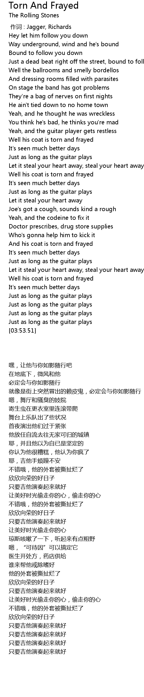 | [03:22.70] | Well his coat is torn and frayed |
