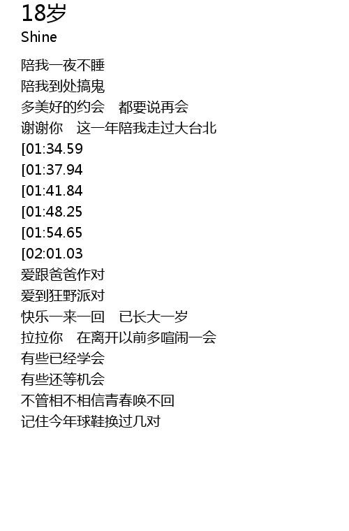 | [02:19.50][01:37.94][00:30.68] | 只有体会 才算十八岁 |