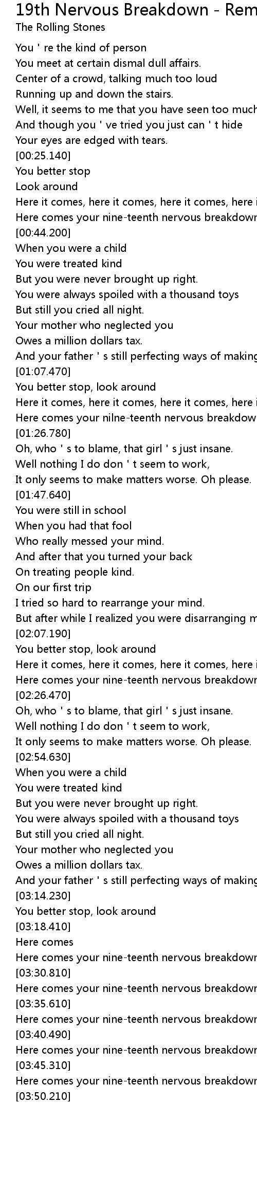 | [03:47.110] | Here comes your nineteenth nervous breakdown |