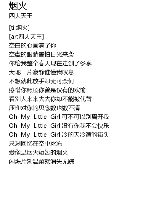 | [01:07.376] | Oh My Little Girl kě bù kě yǐ bié lí kāi wǒ |