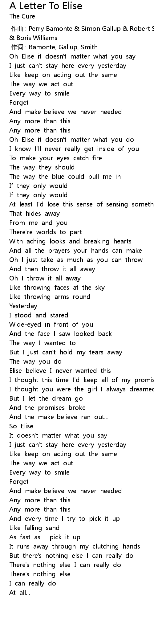 | [00:38.56] | Oh Elise it doesn't matter what you say |
