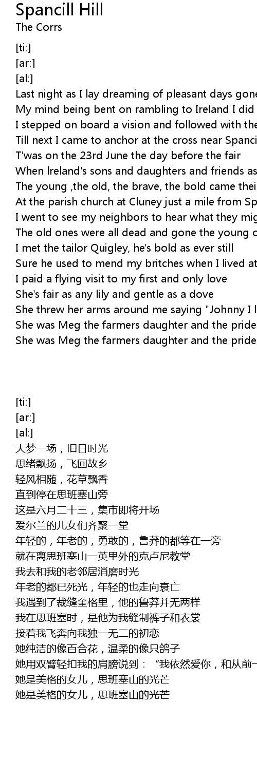 | [00:45.42] | Till next I came to anchor at the cross near Spancill Hill |