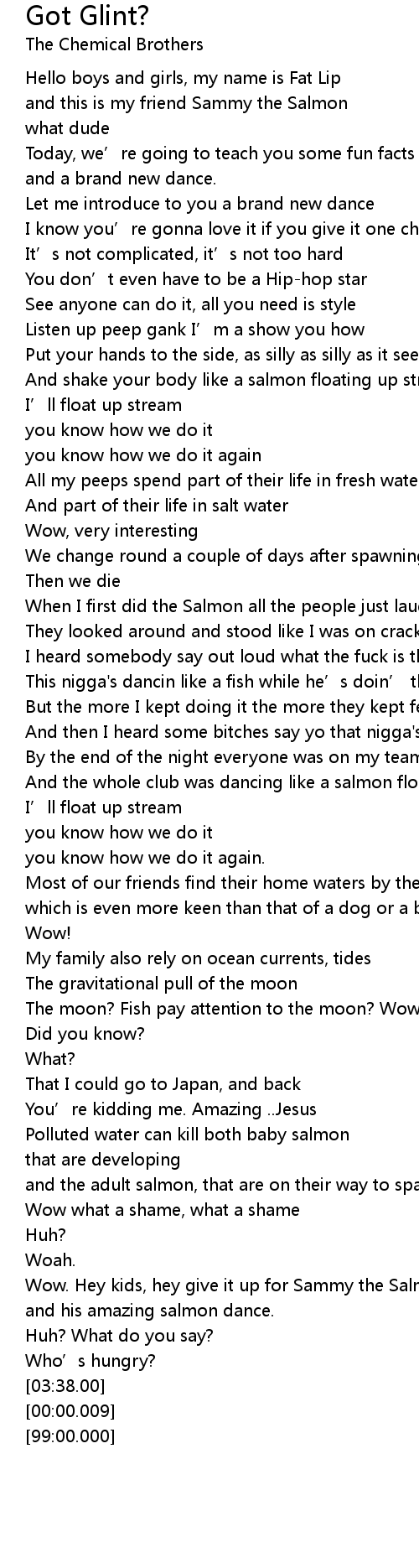 | [01:55.49] | And the whole club was dancing like a salmon floating up stream! |