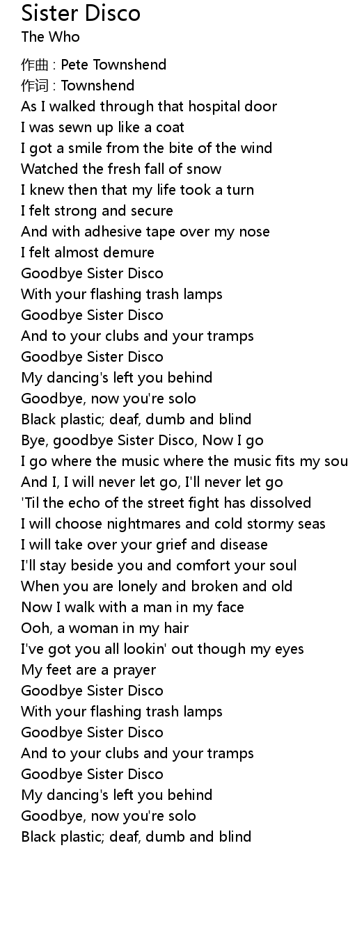 | Bye, goodbye Sister Disco, Now I go | |