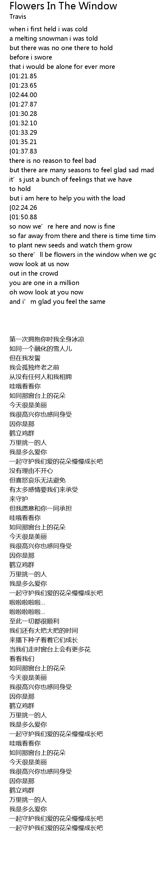 | [00:44.19][01:23.65][02:22.40][02:42.14] | flowers in the window |
