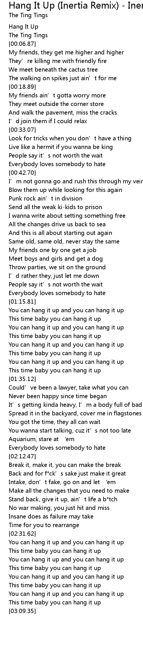 | [00:02.91] | Hang It Up |
