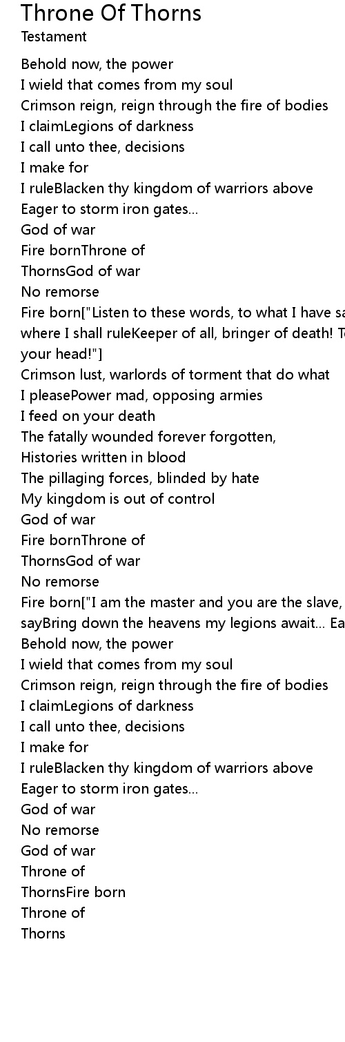 Fire born["Listen to these words, to what I have saidFrom my throne of thorns is where I shall ruleKeeper of all, bringer of death! To challenge me, off with your head!"] |