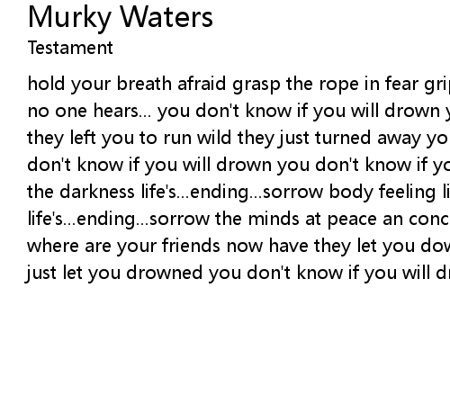 | hold your breath afraid grasp the rope in fear grip just slips away you yell but no one hears... you don't know if you will drown your friends showed you the way they left you to run wild they just turned away your angered with a smile you don't know if you will drown you don't know if you'll be found or not drowing in the darkness life's...ending...sorrow body feeling lifeless life's...ending...sorrow the minds at peace an concious life's...ending...sorrow where are your friends now have they let you down they can't bring you back they just let you drowned you don't know if you will drown |