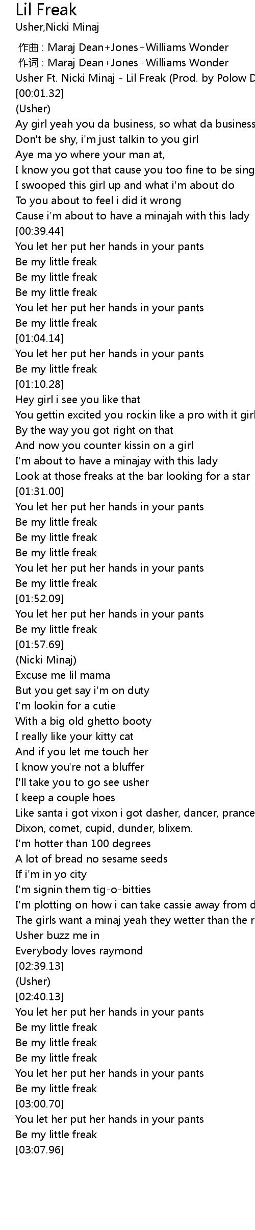 | [00:00.32] | Usher Ft. Nicki Minaj Lil Freak Prod. by Polow Da Don |