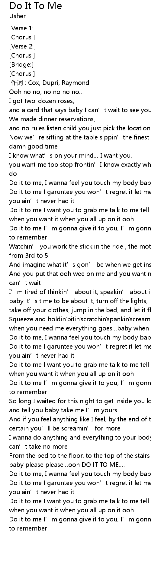 | [02:53.74] | From the bed to the floor, to the top of the stairs you gon' get it baby please please ooh DO IT TO ME. |