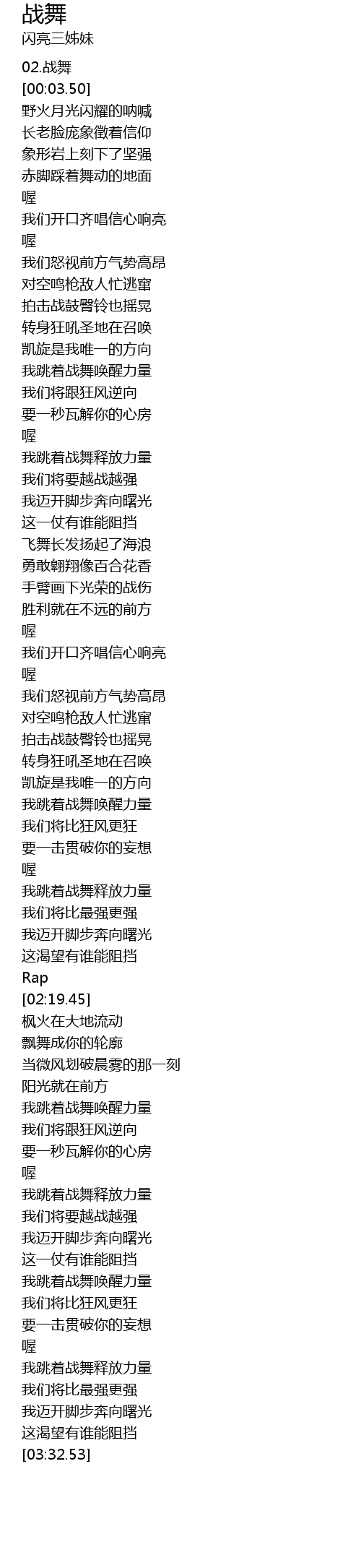 | [02:58.83] | wǒ tiào zhe zhàn wǔ shì fàng lì liàng |