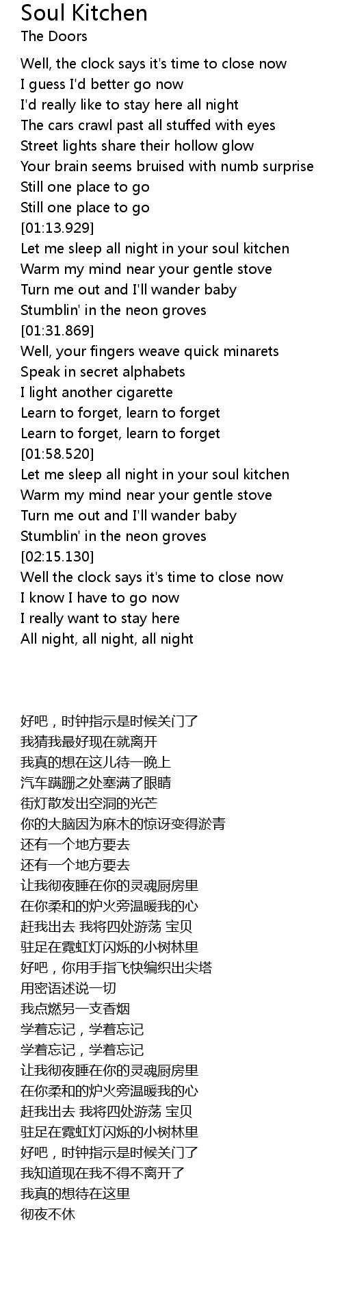 | [01:15.500] | Let me sleep all night in your soul kitchen |