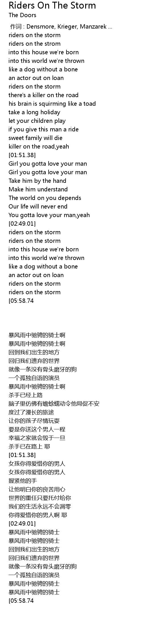 | [06:03.38][05:58.74][05:54.25] | riders on the storm |
