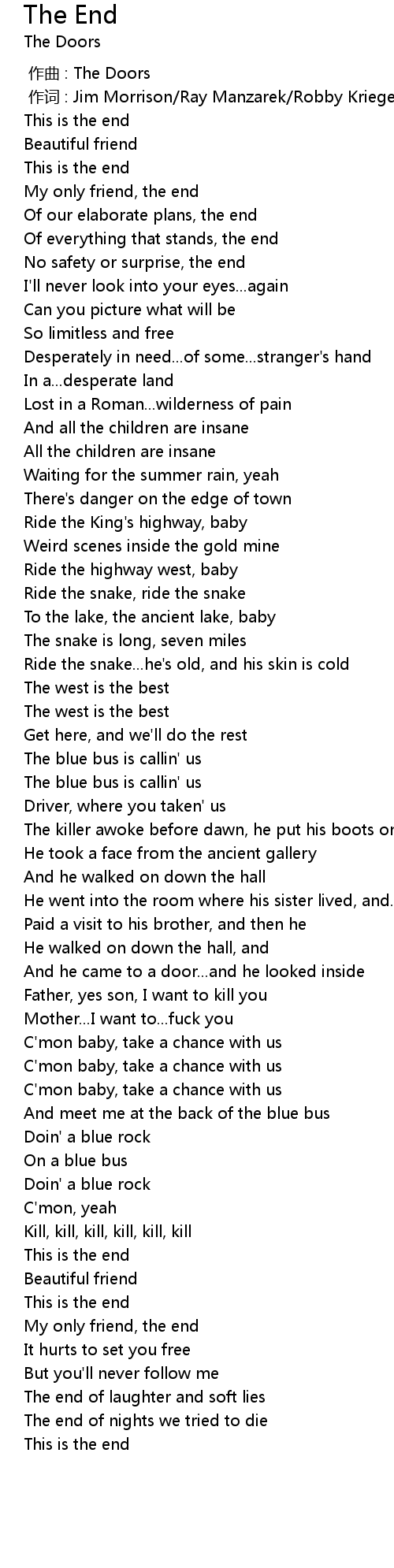 | [00:01.00] | 作词 : Jim Morrison/Ray Manzarek/Robby Krieger/John Densmore |