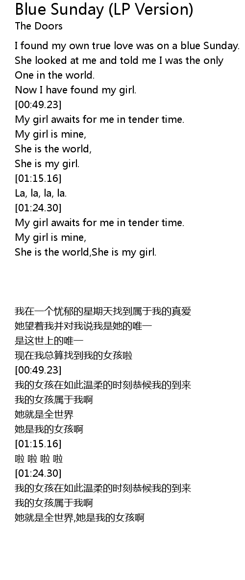 | [00:19.40] | I found my own true love was on a blue Sunday. |