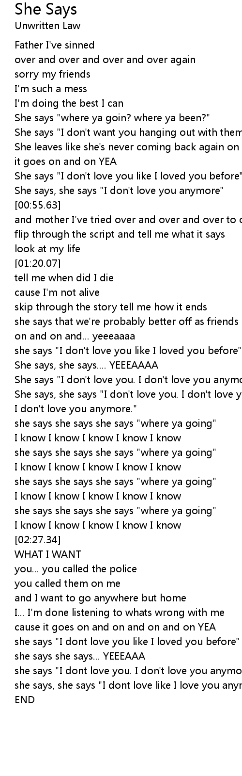 she says, she says "I dont love like I love you anymore." |