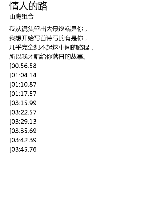 | [04:15.16][03:35.69][02:56.23][01:47.94] | 一生的时间为了爱情的脚步。 |
