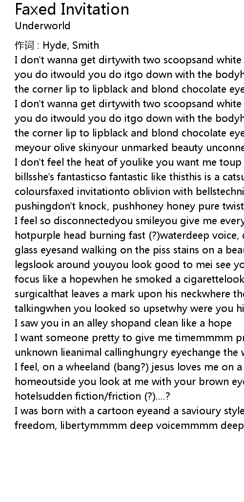| I don' t feel the heat of youlike you want me toup close and smilingno seperate billsshe' s fantasticso fantastic like thisthis is a catsuit of fifteen coloursfaxed invitationto oblivion with bellstechnicolour delightssomeone pushingdon' t knock, pushhoney honey pure twistedsqueeze your libido.... | |