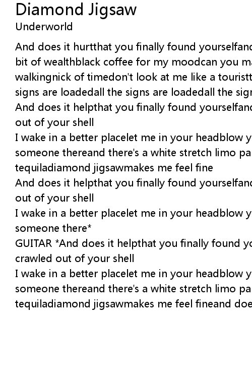 I wake in a better placelet me in your headblow your horn in the darkthere's someone thereand there's a white stretch limo parked ona single linepremium tequiladiamond jigsawmakes me feel fineand does it help (repeat) |
