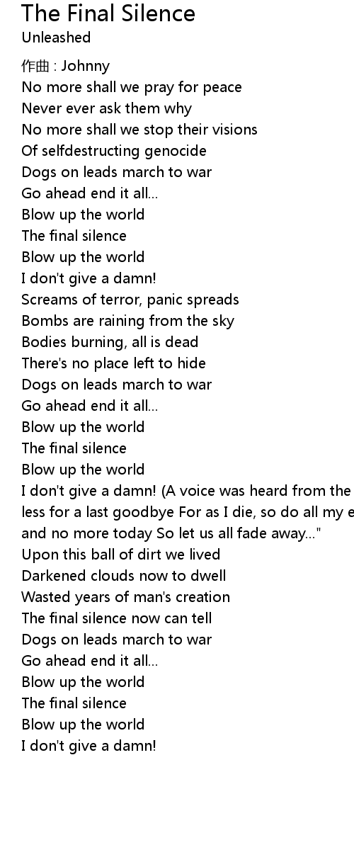 | I don' t give a damn! A voice was heard from the battle field " Couldn' t care less for a last goodbye For as I die, so do all my enemies There' s no tomorrow, and no more today So let us all fade away..." | |