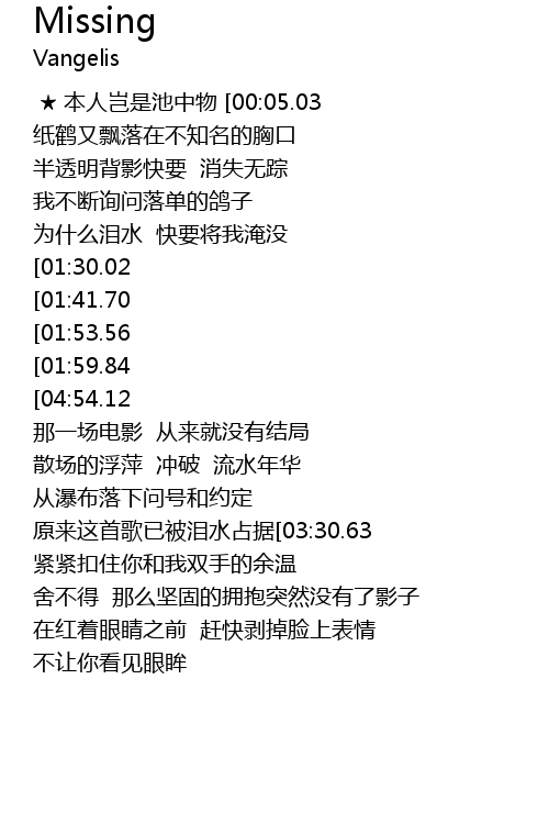 | [02:54.20]原来这首歌已被泪水占据[03:30.63] | 舍不得 紧紧扣住你和我双手的余温 |