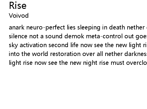| anark neuro-perfect lies sleeping in death nether darkness underground scared silence not a sound demok meta-control out goes the signal radiation from the sky activation second life now see the new light rise anark returns to earth out into the world restoration over all nether darkness as before now see the new light rise now see the new night rise must overcloud dark like before... |