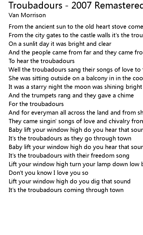 From the ancient sun to the old heart stove come the troubadours |