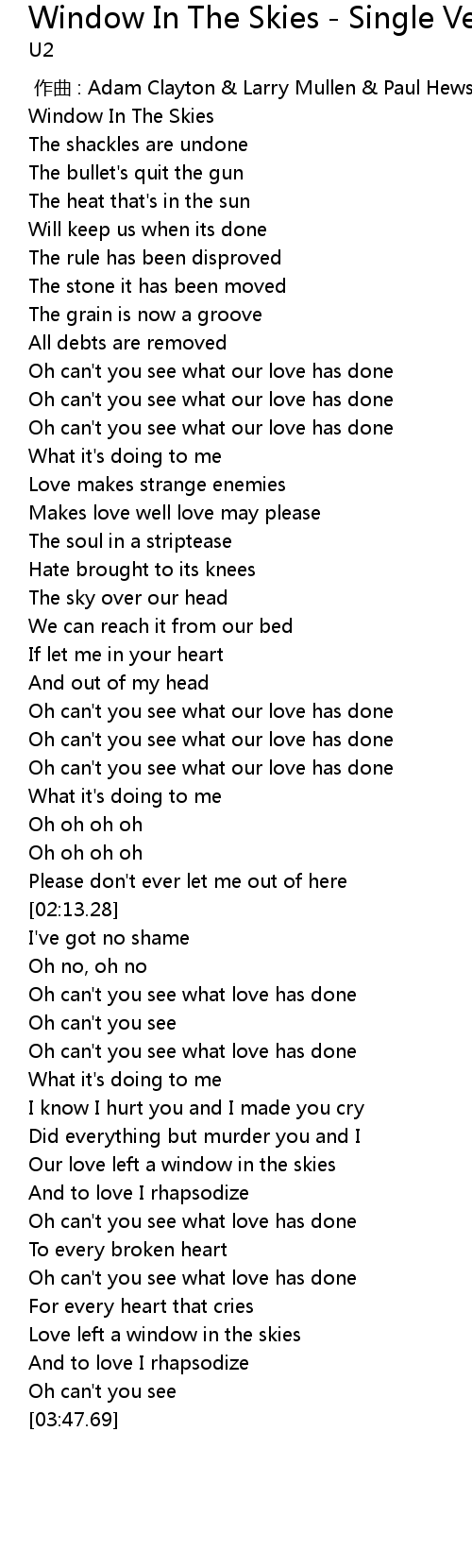 [00:00.00] zuo qu : Adam Clayton Larry Mullen Paul Hewson Dave Evans