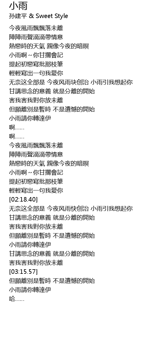 | [02:02.36] | 小雨啊~你甘擱會記 |