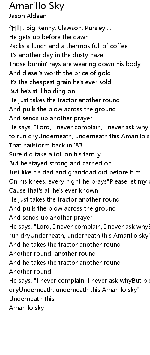 | He says, " Lord, I never complain, I never ask whyBut please don' t let my dream to run dryUnderneath, underneath this Amarillo sky" | |