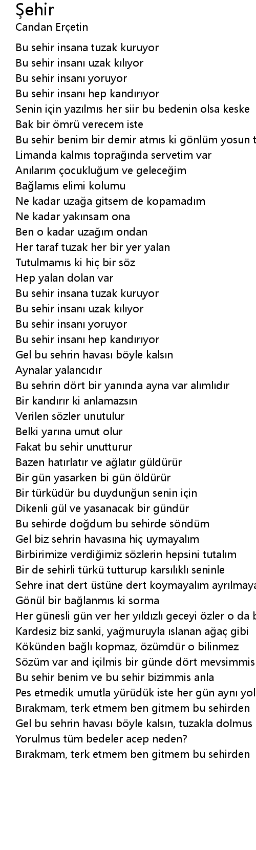 | Sehre inat dert ü stü ne dert koymayal m ayr lmayal m | |