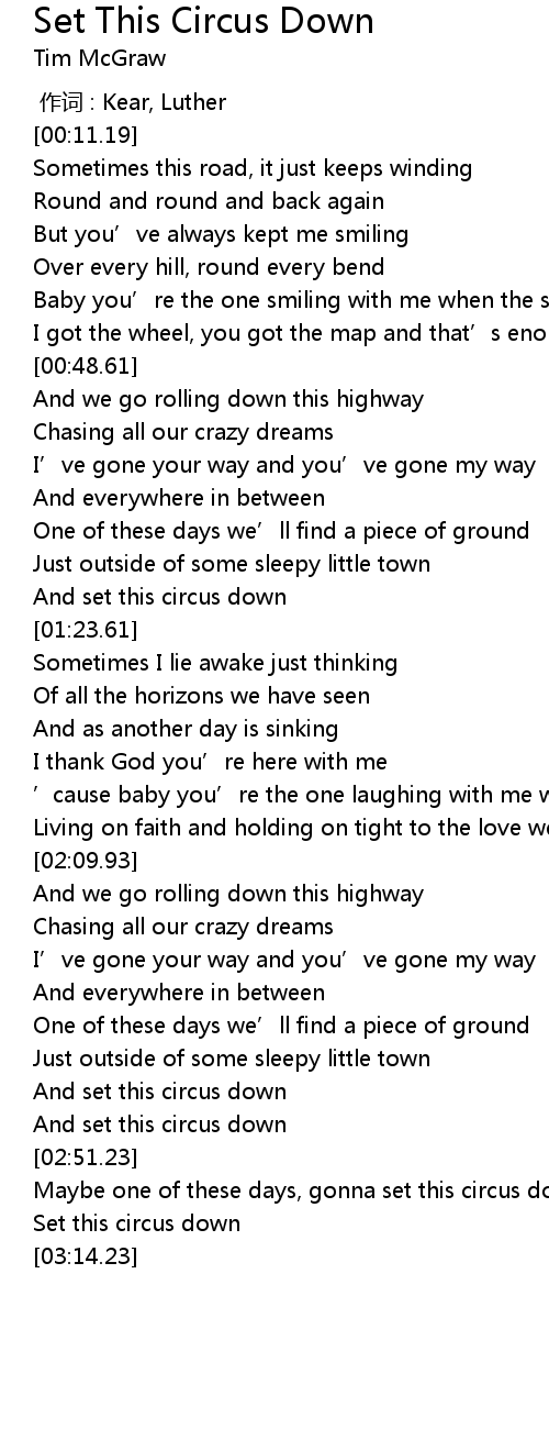 | [02:54.60] | Maybe one of these days, gonna set this circus down |